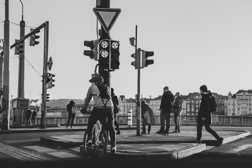 A vibrant street moment full of movement, frozen in strong black and white contrast.